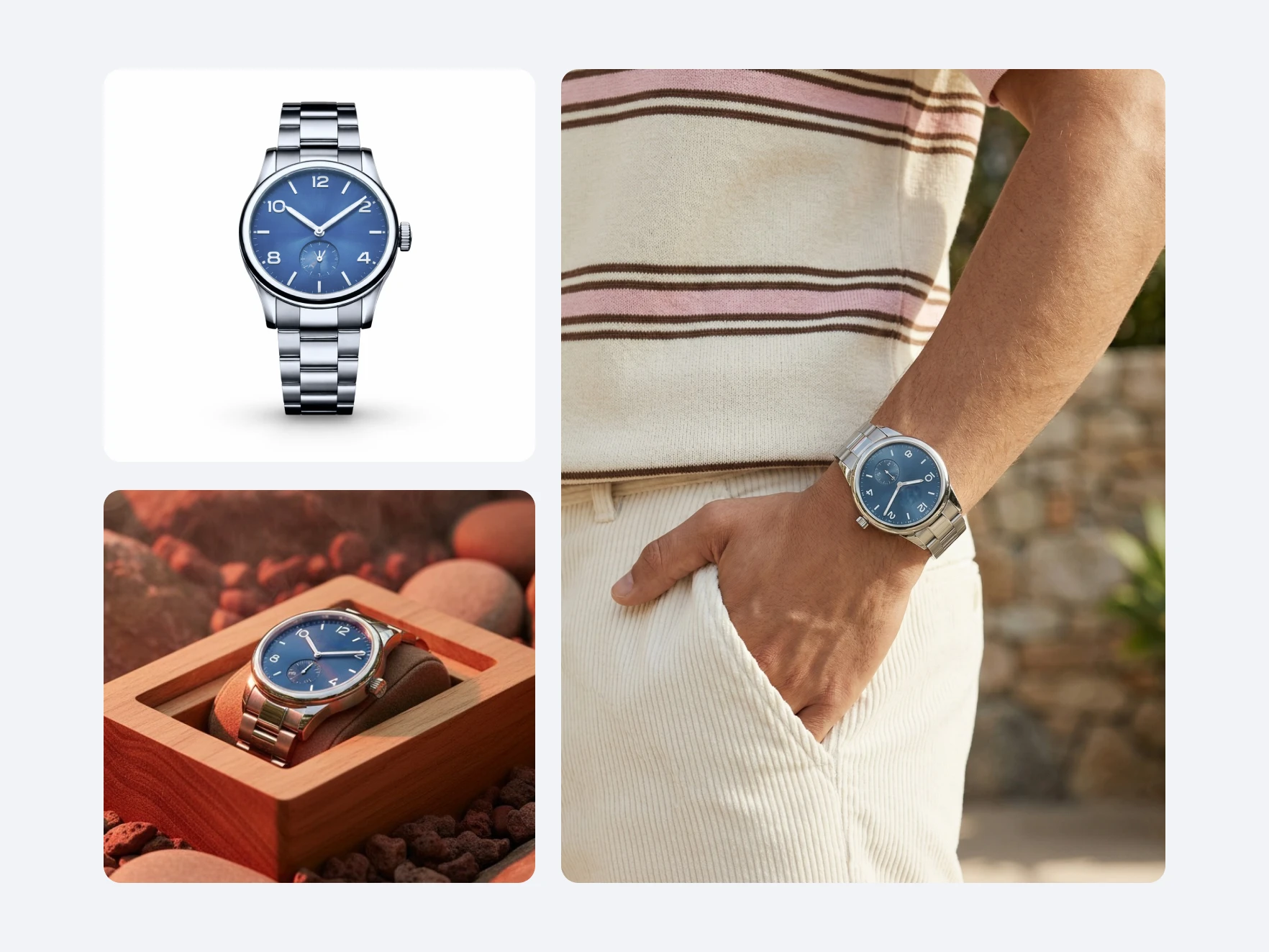 Adjust the output to make sure it reflects your brand and your product. Adjust lighting, refine tones, and choose between clean backgrounds or realistic settings.