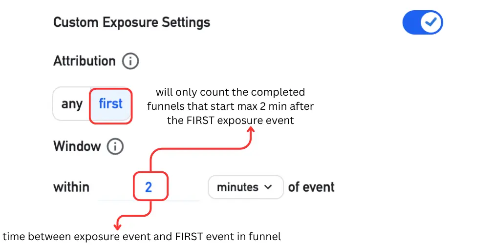 Amplitude will only count the funnels (if your success metric is a funnel) that started X min (window) after the very FIRST exposure event. Useful when exposure should only affect metrics in a limited time window.